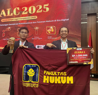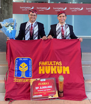 [KALIURANG]; Fakultas Hukum (FH) Universitas Islam Indonesia (UII) kembali bersuka cita atas prestasi yang diukir para mahasiswa dalam kompetisi hukum di bidang kepenulisan berskala nasional. Elang Putra Haninggar (22410048) dan Rafi Firoos Muhammad Utyan (23410292) tergabung dalam satu tim berhasil membawa Juara 2 Legal Opinion Competition dalam kegiatan Sunan Ampel Legal Competition 2025 yang diadakan oleh Universitas Islam Negeri (UIN) Sunan Ampel Surabaya. Pada ajang kompetisi yang sama, tim lain yang terdiri atas Anang Fajri Perdana (23410784) dan Muhammad Alif Ahsan (23410692) turut meraih Juara 3 Legal Opinion Competition.