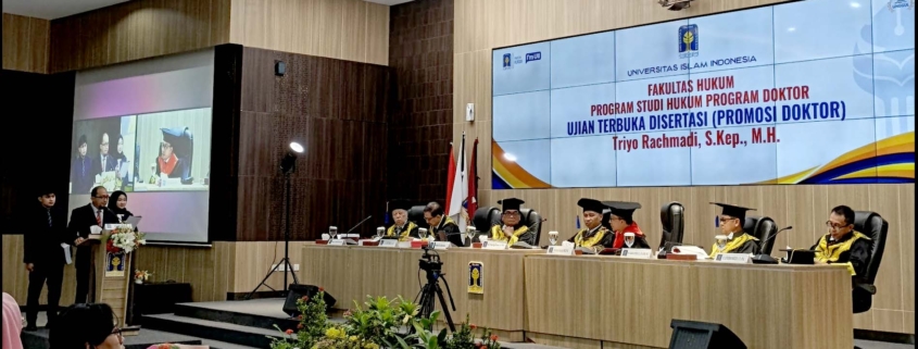 Yogyakarta, 8 November 2025, Trio Rachmadi memaparkan hasil penelitian disertasi di depan penguji pada Sabtu, 8 November 2025, Pukul 14.30 WIB bertempat di ruang Auditorium lantai 4 Fakultas Hukum Universitas Islam Indonesia. Trio Rachmadi berhasil memperoleh gelar Doktor yang ke 197 Dari Program Studi Hukum Program Doktor Fakultas Hukum Universitas Islam Indonesia. Promovendus mempertahankan disertasinya yang berjudul “Politik Hukum Kesehatan di Indonesia (Studi tentang Urgensi Ethics of Rights dan Ethics of Care dalam Pembentukan Peraturan Perundang-Undangan Bidang Kesehatan: Evaluasi Kritis terhadap Undang-Undang RI Nomor 17 Tahun 2023 tentang Kesehatan).