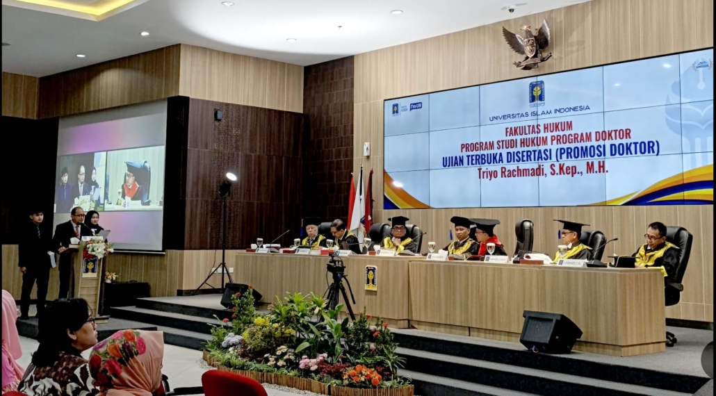 Yogyakarta, 8 November 2025, Trio Rachmadi memaparkan hasil penelitian disertasi di depan penguji pada Sabtu, 8 November 2025, Pukul 14.30 WIB bertempat di ruang Auditorium lantai 4 Fakultas Hukum Universitas Islam Indonesia. Trio Rachmadi berhasil memperoleh gelar Doktor yang ke 197 Dari Program Studi Hukum Program Doktor Fakultas Hukum Universitas Islam Indonesia. Promovendus mempertahankan disertasinya yang berjudul “Politik Hukum Kesehatan di Indonesia (Studi tentang Urgensi Ethics of Rights dan Ethics of Care dalam Pembentukan Peraturan Perundang-Undangan Bidang Kesehatan: Evaluasi Kritis terhadap Undang-Undang RI Nomor 17 Tahun 2023 tentang Kesehatan).