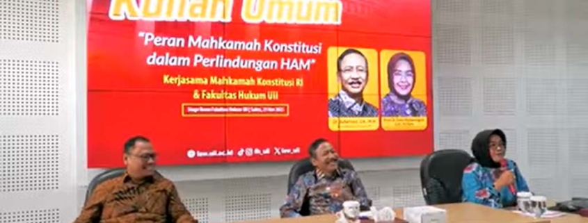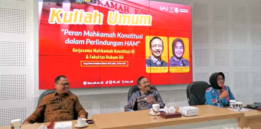 Yogyakarta, Sabtu, 29 November 2025. Kolaborasi Mahkamah Konstitusi (MK) dan Fakultas Hukum UII menggelar kuliah umum dengan tema Peran Mahkamah Konstitusi dan Perlindungan HAM. Kuliah umum di Fakultas Hukum UII diselenggarakan untuk mahasiswa magister hukum dan program doktor FH UII. Dalam kuliah umum yang diselenggarakan hadir Ketua Mahkamah Konstitusi YM Suhartoyo dan hakim konstitusi Enny Nurbaningsih. Kuliah umum dimoderatori oleh Panitera Mahkamah Konstitusi Achmad Edi Subiyanto. Tentunya kehadiran Ketua MK dan Hakim konstitusi tentunya disambut baik oleh seluruh jajaran pimpinan Universitas dan Fakultas Hukum UII.