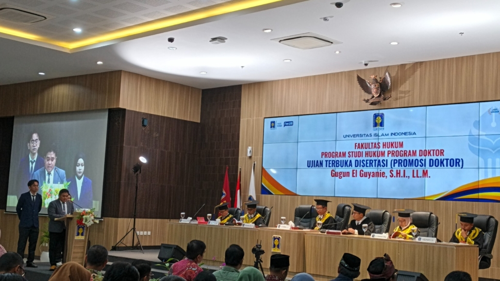 Gugun El Guyanie berhasil menyelesaikan disertasinya dibawah bimbingan Promotor Prof. Dr. Suparman Marzuki, S.H., M.Si., Co Promotor Dr. Idul Rishan, S.H., LL.M. Hadir sebagai penguji dalam ujian terbuka Prof. Dr. M. Syamsudin, S.H., M.Hum., sebagai ketua Penguji dan anggota penguji yakni, Prof. Purwo Santoso, M.A., Ph.D., Dr. Abdul Gaffar Karim, S.I.P., M.A., Prof. Dr. Ni’matul Huda, S.H., M.Hum., dan Dr. Jamaludin Ghafur, S.H., M.H.