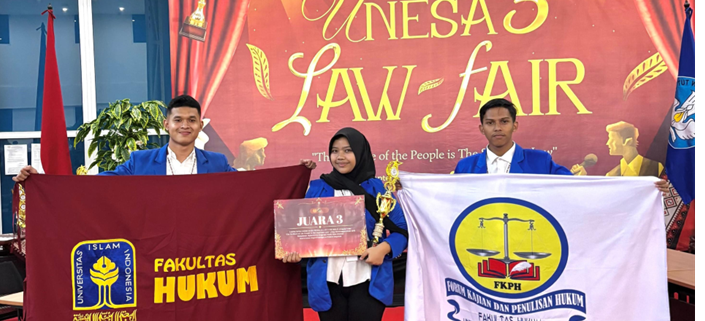 [KALIURANG]; Prestasi gemilang kembali diukir oleh mahasiswa Fakultas Hukum (FH) Universitas Islam Indonesia (UII) dalam ajang UNESA 5 Law Fair (U5LF) 2025 dengan mengangkat tema “The Welfare of the People is The Supreme Law” yang diselenggarakan oleh Universitas Negeri Surabaya pada Sabtu, 20 September 2025 silam. Adapun tim dari FH UII terdiri atas Raihan Restu Putra (24410188), Nisrina Hanif Fadhila (22410228), dan Muhammad Rifqi Firdaus (22410887) yang tergabung dalam delegasi tim debat dan meraih juara 3 cabang lomba debat.