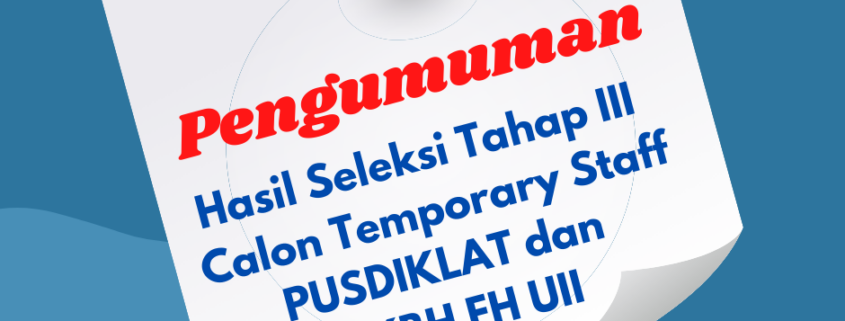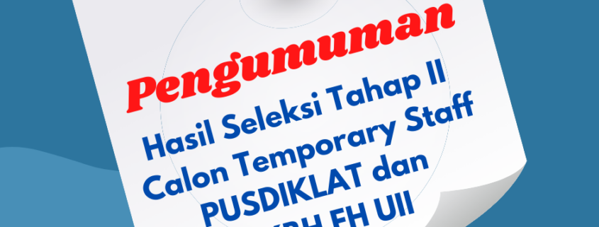 Pimpinan Fakultas Hukum Universitas Islam Indonesia dengan ini mengumumkan nama-nama pelamar calon Temporary Staff Pusdiklat dan PKBH Fakultas Hukum Universitas Islam Indonesia yang dinyatakan lulus seleksi dan diterima sebagai Temporary Staff Pusdiklat dan PKBH Fakultas Hukum Universitas Islam Indonesia Periode 2025. Selanjutnya kepada peserta seleksi Temporary Staff Pusdiklat dan PKBH Fakultas Hukum Universitas Islam Indonesia yang dinyatakan diterima