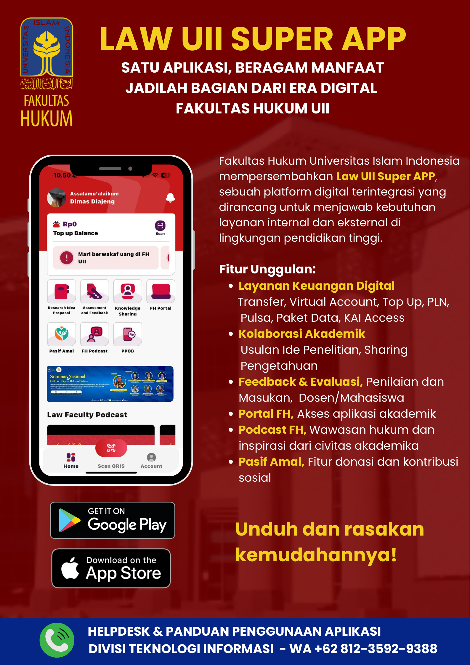 Fakultas Hukum Universitas Islam Indonesia, melalui platform digital terpadu Law UII Super App, menawarkan solusi aplikasi mobile yang dirancang untuk mendukung digitalisasi layanan internal dan eksternal institusi, khususnya di sektor pendidikan tinggi.