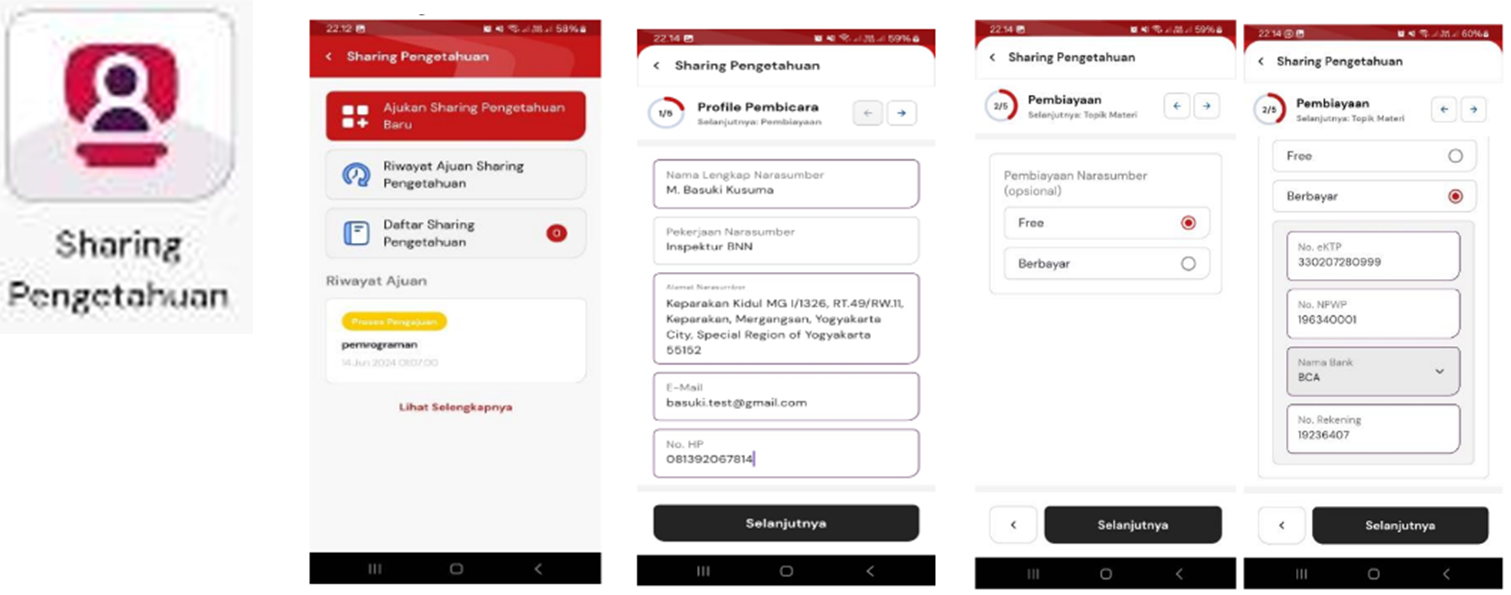 Fitur Sharing Pengetahuan memungkinkan pengguna untuk mengajukan sesi berbagi ilmu dan pengalaman secara formal. Tersedia formulir untuk pengajuan sharing baru yang mencakup profil pembicara, topik materi, rincian pelaksanaan, serta estimasi pembiayaan. Pengguna juga dapat mengunggah dokumen pendukung seperti CV dan materi presentasi. Selain itu, fitur ini menyediakan menu Riwayat Ajuan dan Daftar Sharing untuk memantau rekam jejak serta status pengajuan yang telah dilakukan. Tujuan utama fitur ini adalah membangun ekosistem pembelajaran dan kolaborasi yang aktif di lingkungan institusi.