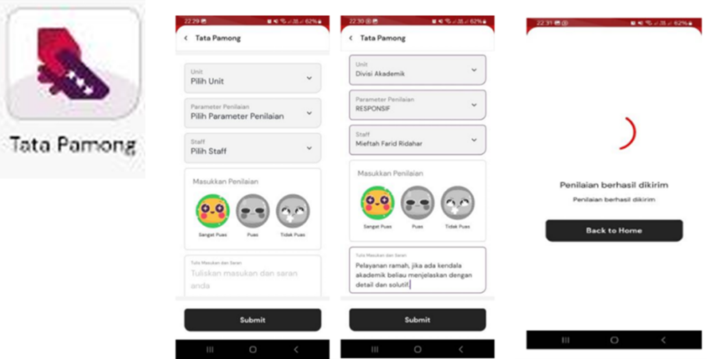 Fitur Tata Pamong dirancang untuk mendukung proses evaluasi kinerja pegawai secara objektif dan interaktif. Pengguna dapat memilih unit kerja, menentukan parameter penilaian, serta memilih pegawai yang akan dinilai. Penilaian kinerja dilakukan melalui pilihan ekspresi visual berupa ikon yang merepresentasikan tingkat kepuasan—‘Sangat Puas’, ‘Puas’, dan ‘Tidak Puas’. Selain itu, tersedia kolom khusus untuk menyampaikan kritik dan saran dalam bentuk teks sebagai bagian dari upaya perbaikan dan pengembangan SDM secara menyeluruh.